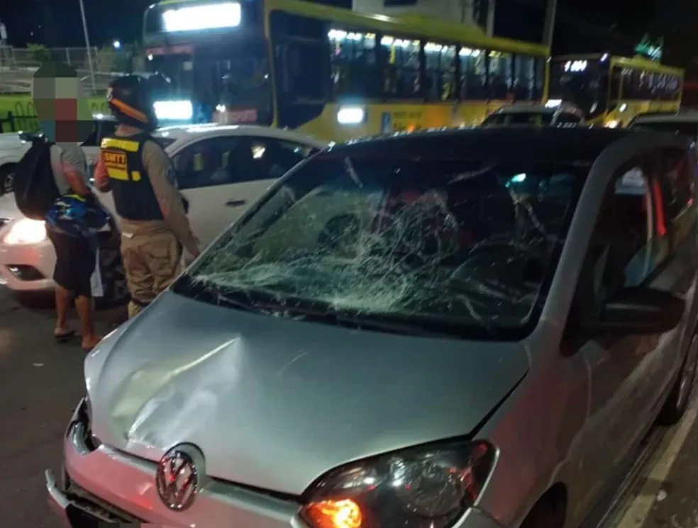 O impacto foi tão forte que o carro teve o para-brisa quebrado e parte da frente danificada.