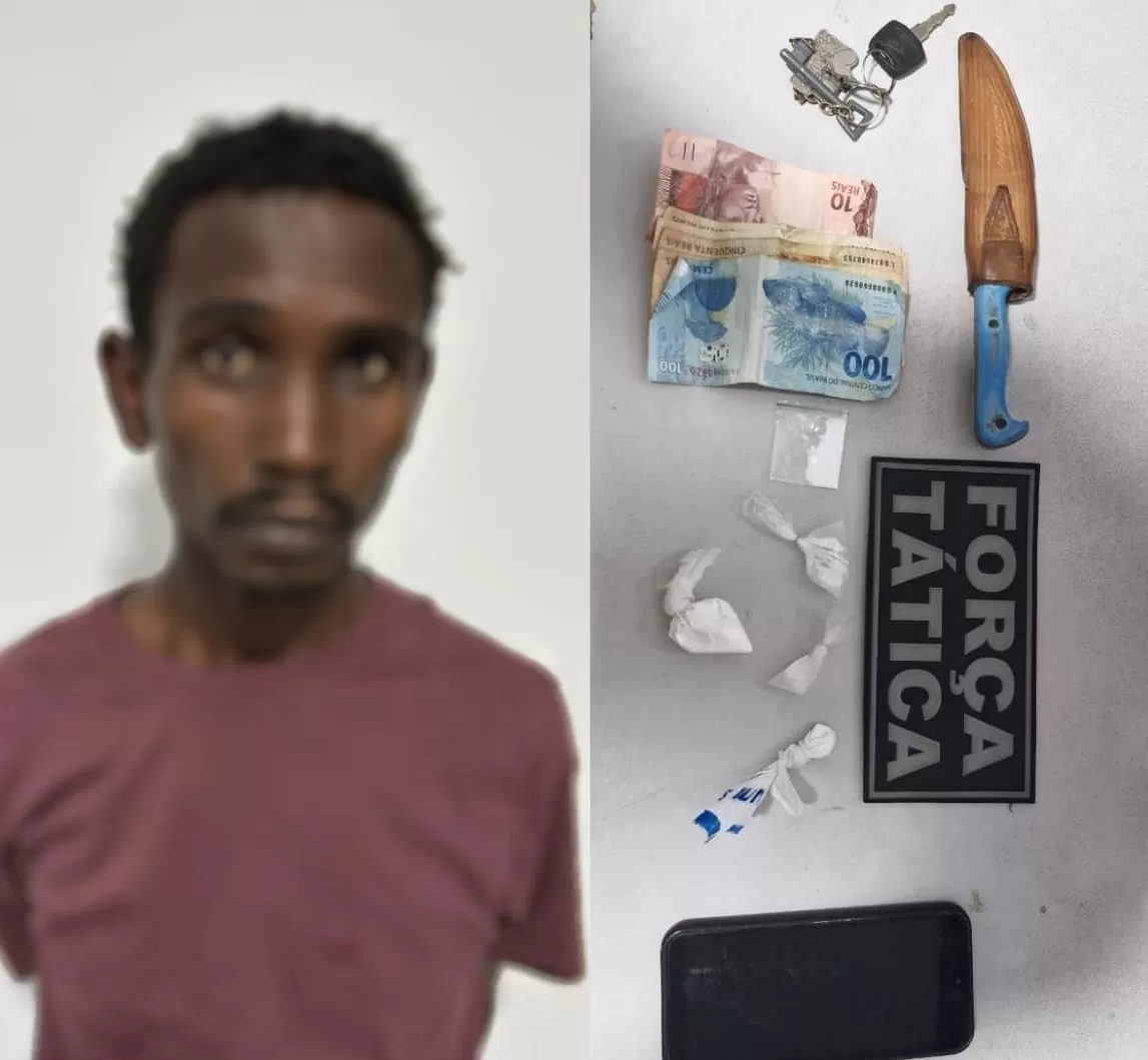 A equipe de plantão da PM recebeu denúncias apontando que um homem vestindo camisa vinho e bermuda jeans estaria comercializando entorpecentes ao lado da Panificadora Boa Sorte.