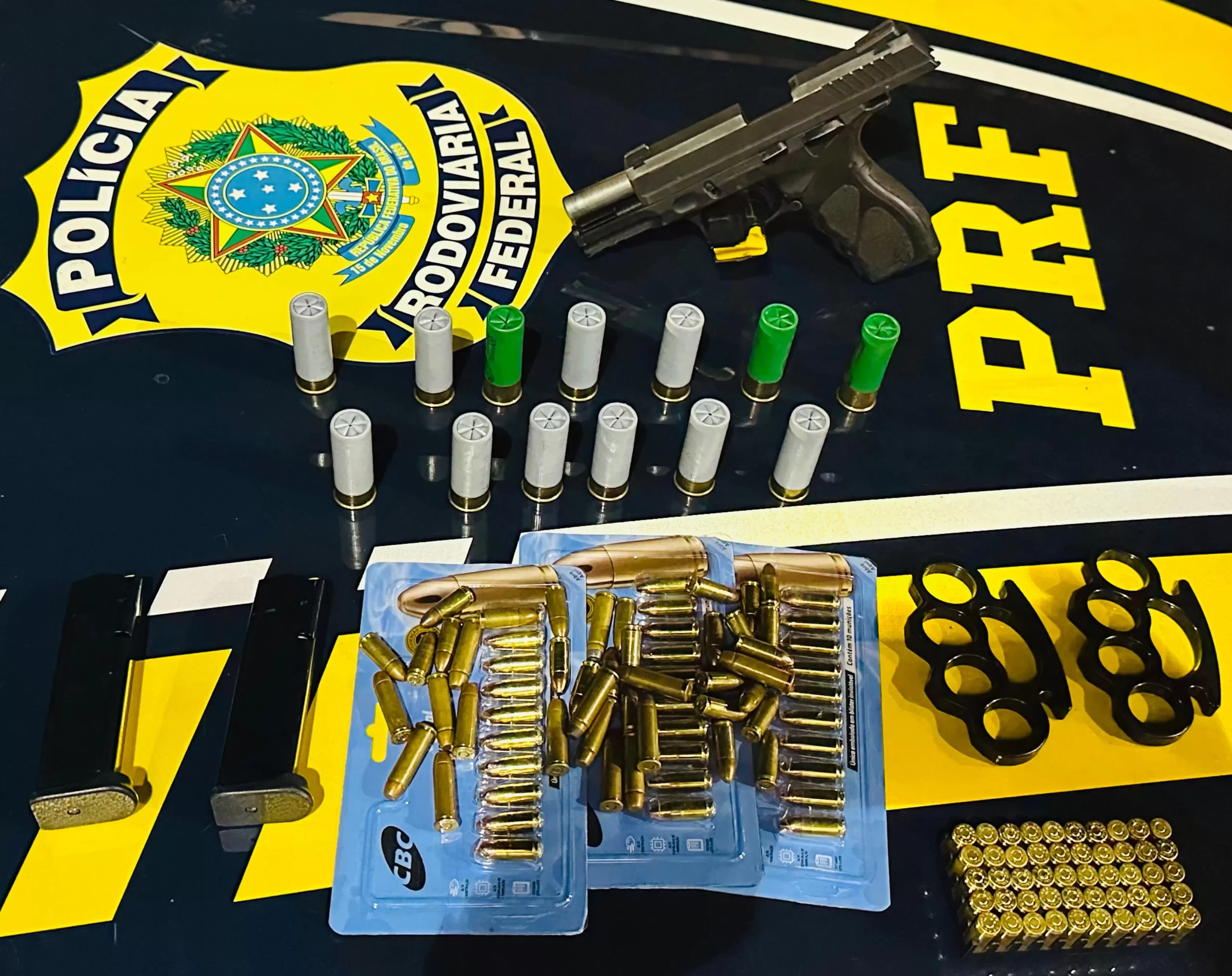 Durante a vistoria no interior do automóvel, os agentes encontraram uma pistola e várias munições de diversos calibres.