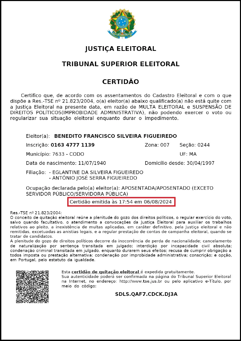 O Tribunal Superior Eleitoral (TSE) emitiu uma certidão às 17h54 desta terça-feira (6), confirmando que o ex-prefeito Biné Figueiredo permanece inelegível para a disputa pela Prefeitura de Codó. A decisão do TSE mantém a inelegibilidade de Figueiredo, deixando-o fora da corrida eleitoral deste ano.