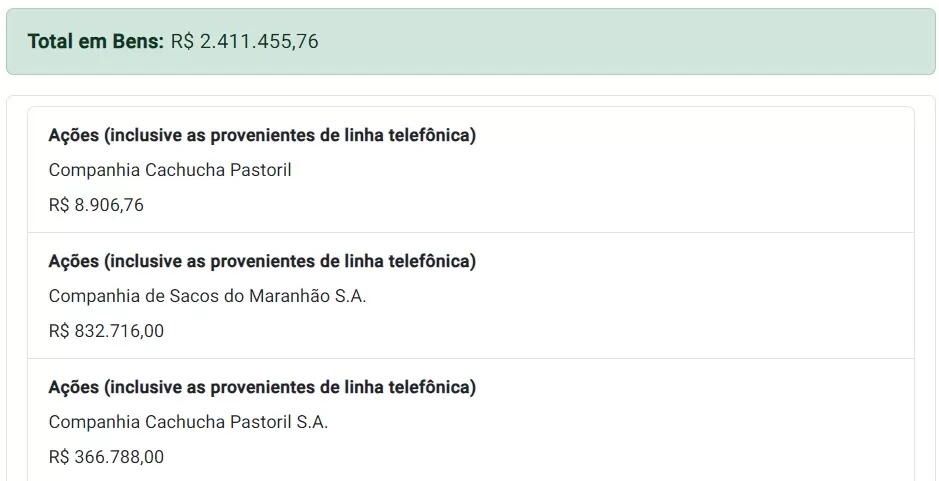 A maior parte de seu patrimônio está investida em ações, totalizando R$ 1.921.114,81. Além disso, ele declarou a posse de dois apartamentos, cada um avaliado em R$ 82.500,00.