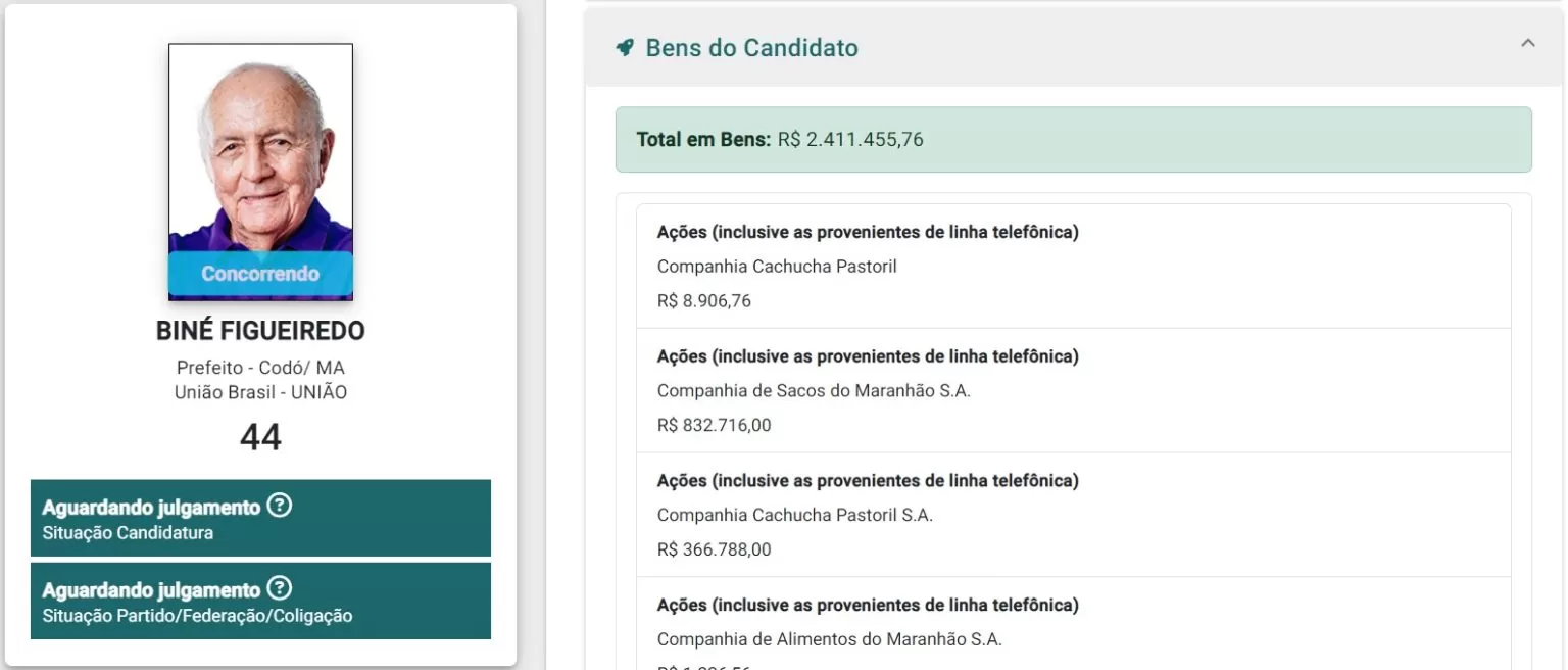 O empresário Biné Figueiredo, candidato a prefeito pelo União Brasil, declarou ao Tribunal Superior Eleitoral (TSE) um patrimônio total de R$ 2.411.455,76.
