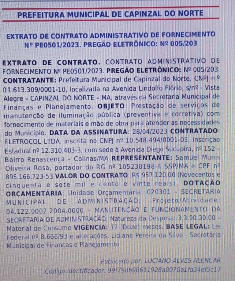 A cidade de Capinzal do Norte, no interior do Maranhão, tem sido alvo de preocupação por parte de seus moradores. Isso porque, segundo informações apuradas pelo Blog do de Sá, o prefeito André Portela assinou um contrato de quase um milhão de reais com uma empresa de Colinas para a manutenção da iluminação pública da cidade.