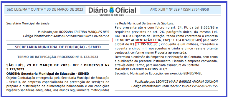 De acordo com informações publicadas no Diário Oficial na última quinta-feira, 30, a empresa escolhida para prestar o serviço foi a RC Nutry Alimentação LTDA, registrada na Receita Federal no bairro Jardim Pinheiro, em São Paulo capital. O contrato prevê a preparação e distribuição de alimentação balanceada e em condições higiênico-sanitárias adequadas aos alunos matriculados na Rede Municipal de Ensino de São Luís, com um valor total de R$ 51.395.935,80.