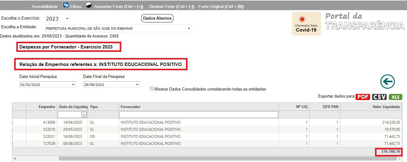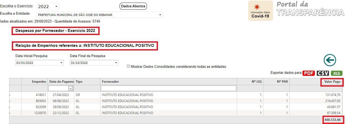 Em 2023, como é possível ver, a Escola já recebeu mais de R$ 370 mil, sendo quatro pagamentos, o último, no valor de R$ 71,4 mil neste mês de agosto.