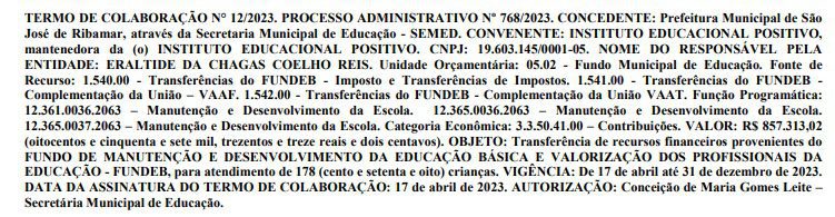 Esse ano, um novo contrato foi assinado em 17 de abril, dessa vez no valor de R$ 857 mil reais, para manter 178 crianças da pequena escola.