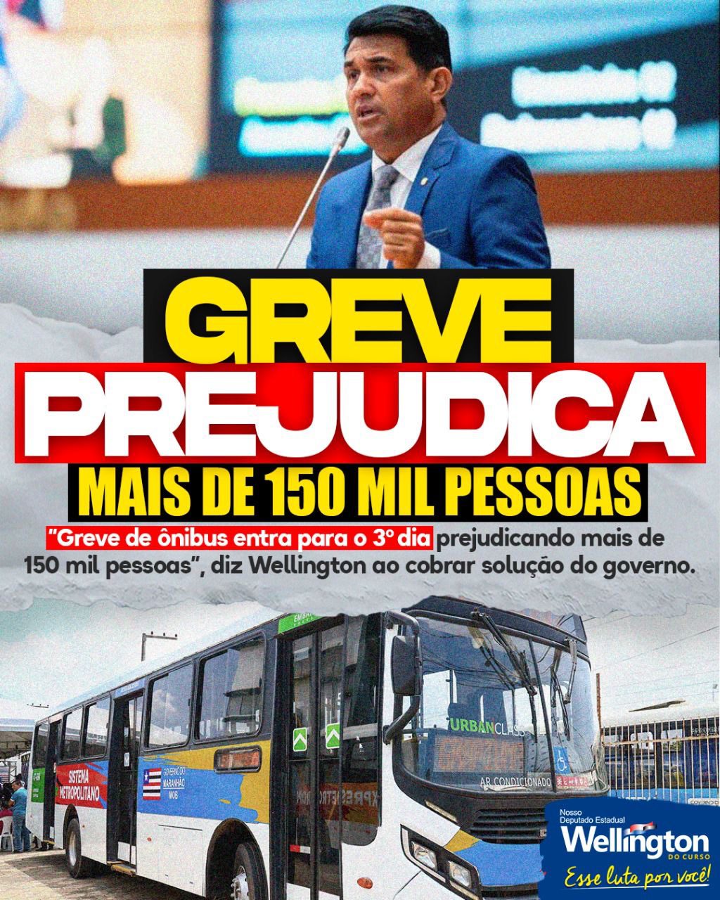 Na manhã deste sábado (27), o deputado estadual Wellington do Curso utilizou as redes sociais para cobrar uma solução por parte do Governo do Estado quanto à greve dos rodoviários do sistema semiurbano da Grande São Luís. Hoje é o terceiro dia de paralisação dos trabalhos.
