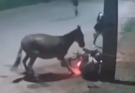 As imagens mostram o momento em que o motociclista é surpreendido pelo animal, perde o controle do veículo e cai, escapando por pouco de bater a cabeça em um poste. Logo após a queda, três suspeitos se aproximam, rendem a vítima e levam a motocicleta, objetos pessoais e até as roupas que ela vestia.