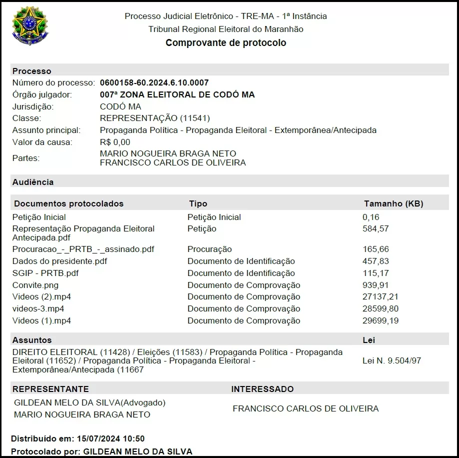 Pré-candidato a prefeito de Codó, o médico Dr. Mário Braga (PRTB) protocolou uma ação na Justiça Eleitoral contestando uma propaganda antecipada realizada pelo empresário Chiquinho FC, durante um evento no dia 12 de julho de 2024. O ato foi amplamente divulgado nas redes sociais e envolveu atividades como carreatas e motocarreatas, levantando questões sobre a legalidade da ação, que deveria ser exclusivamente intrapartidária.