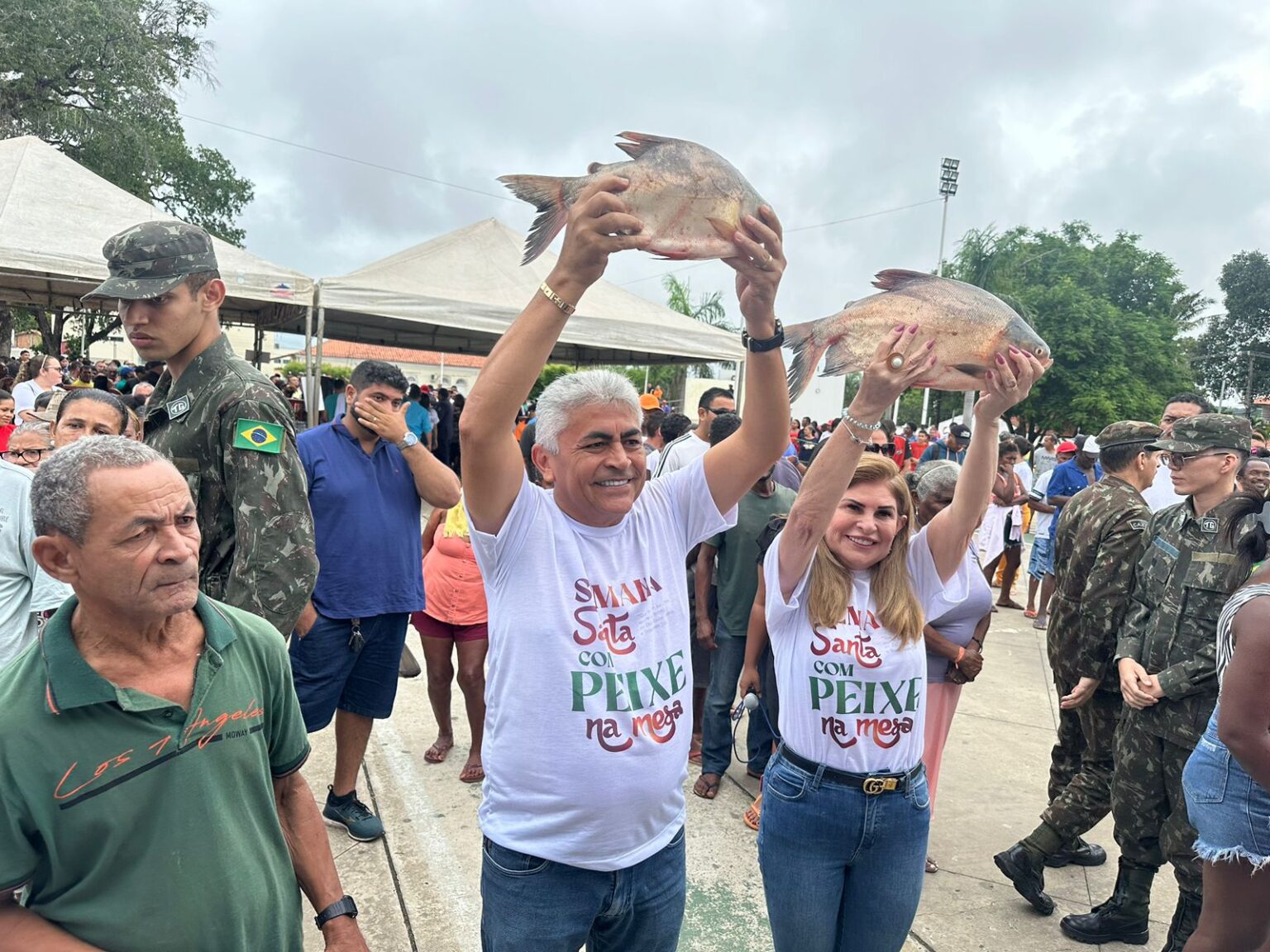 Acompanhado pela primeira-dama Irene Neres, o prefeito supervisionou a distribuição dos peixes, que este ano incluíram tambaqui e tilápia, opções de alta qualidade e frescor.