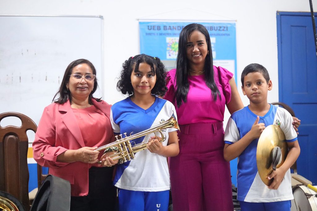 Paula Azevedo e Yanne Pessoa entregam instrumentos musicais para alunos da rede municipal de ensino