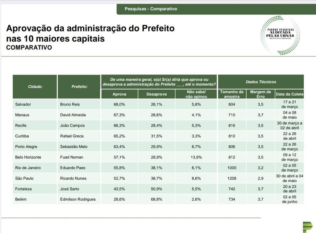 Além de desmentir a postagem do blog maranhense, o levantamento completo com os dados compilados pelo Paraná Pesquisas ao qual tivemos acesso, comprova que a aprovação da administração dos prefeitos leva em consideração apenas 10 maiores capitais, deixando São Luís de fora. VEJA O DOCUMENTO!