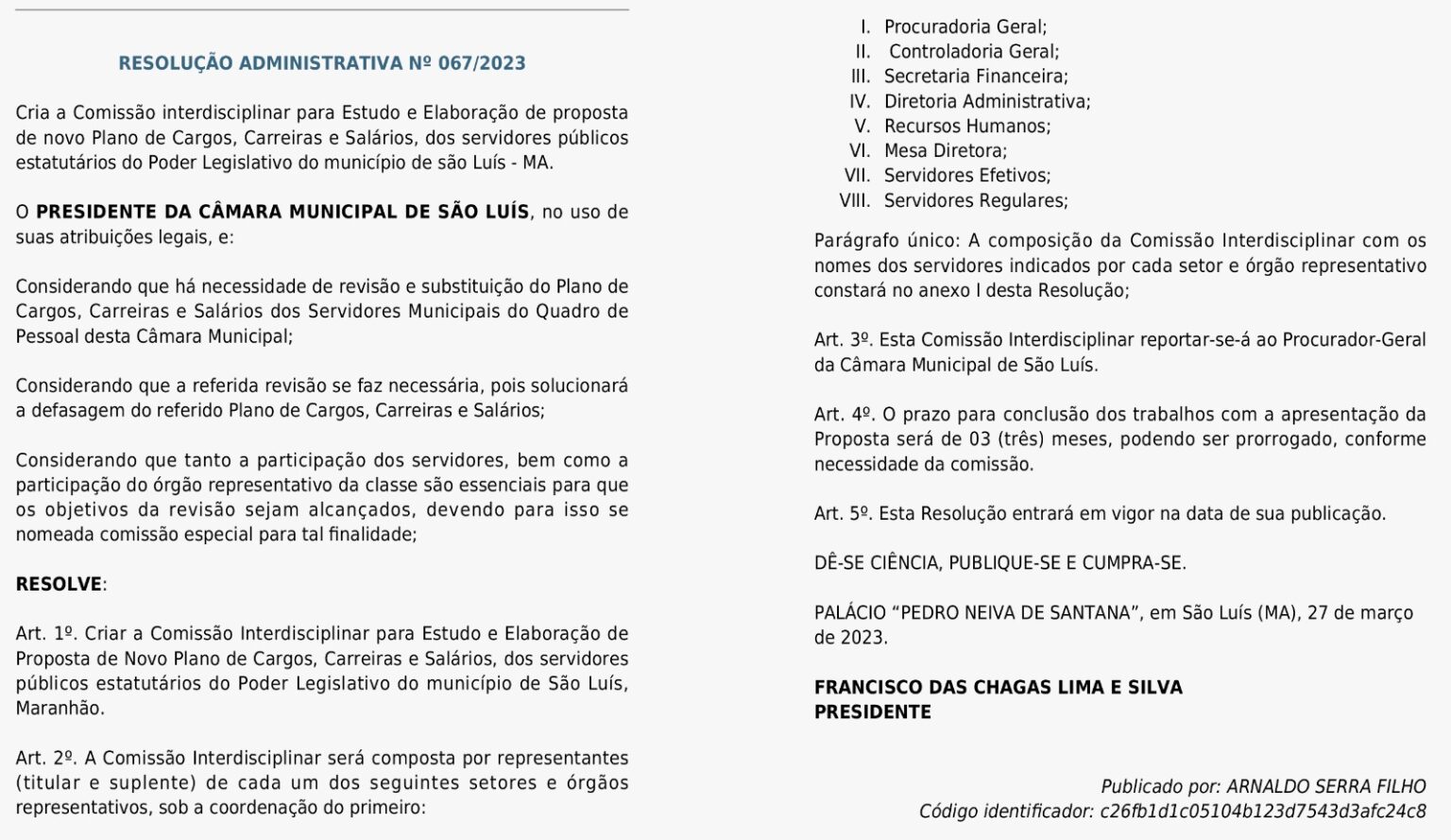 A Câmara Municipal de São Luís, por meio da Resolução Administrativa n.º 067/2023, instituiu a comissão interdisciplinar para estudo e elaboração da proposta do novo Plano de Cargos, Carreiras e Salários dos servidores públicos estatutários do Poder Legislativo. O documento foi publicado na edição dessa segunda-feira, 17, no Diário Oficial do Município (DOM).