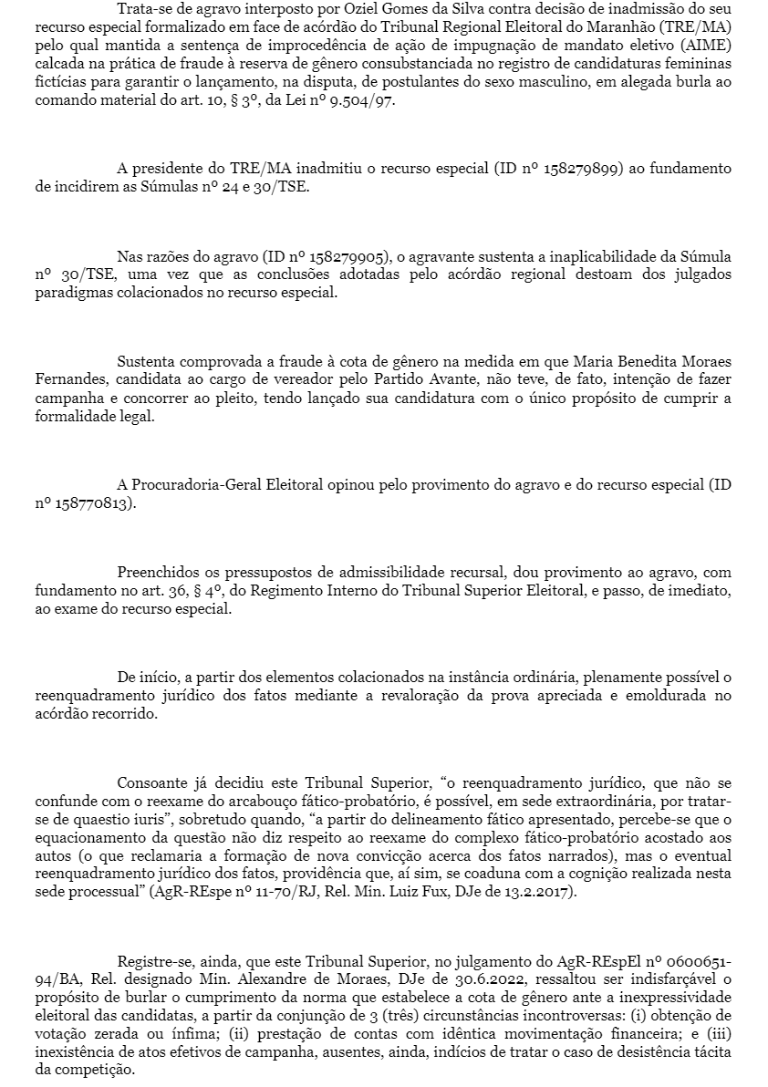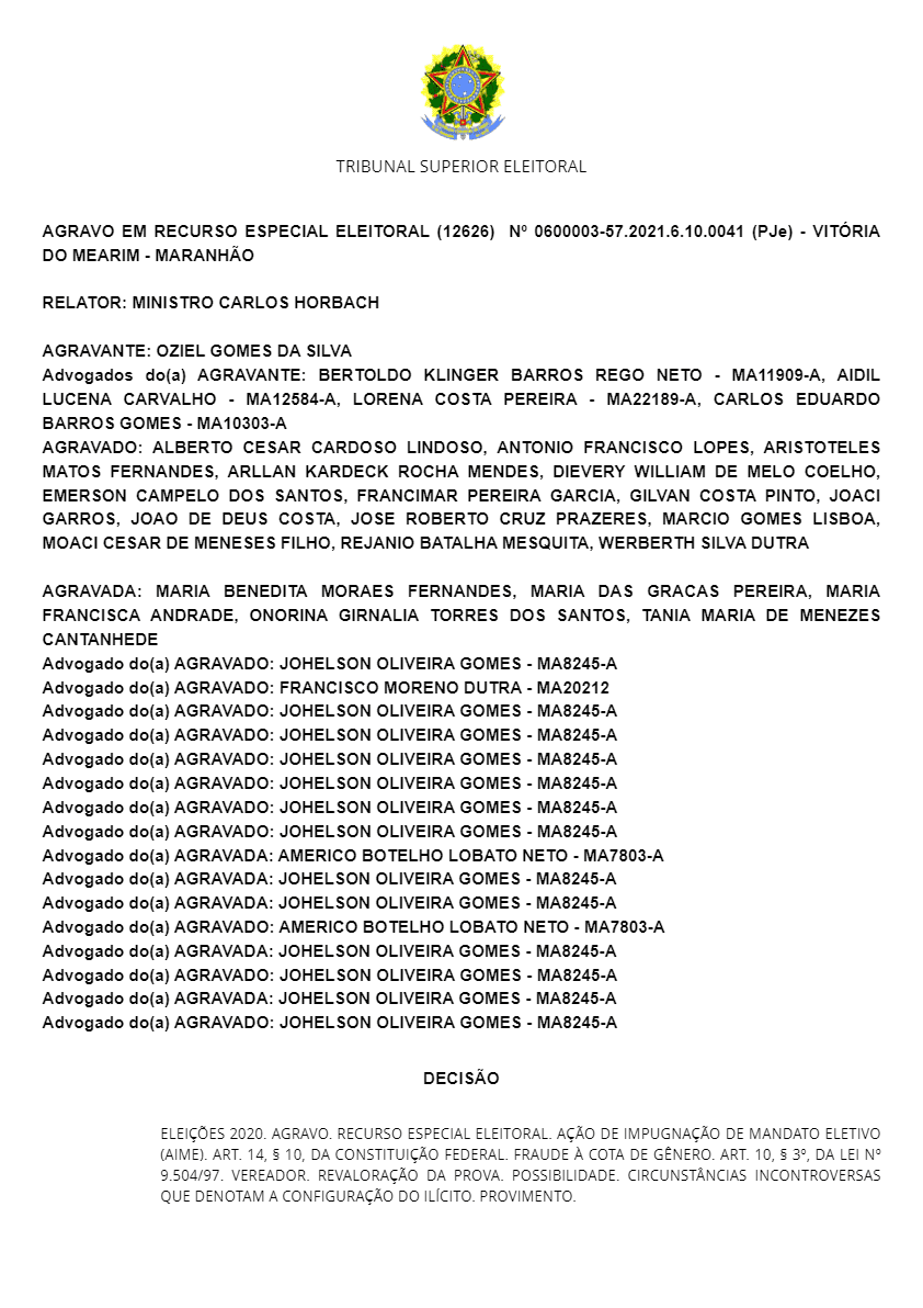 O Tribunal Superior Eleitoral (TSE) decidiu cassar os mandatos de vereadores envolvidos em um esquema de fraude à cota de gênero nas eleições municipais de 2020. A decisão ocorreu após o julgamento de um agravo interposto por Oziel Gomes da Silva, que contestava a decisão do Tribunal Regional Eleitoral do Maranhão (TRE/MA).