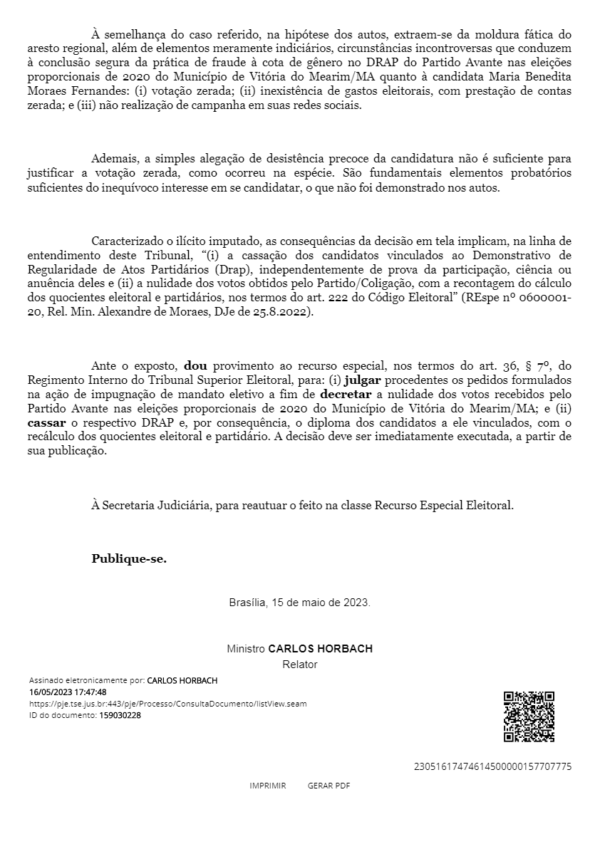 No caso em questão, o TSE identificou as mesmas circunstâncias, além de indícios de que a candidata não realizou campanha em suas redes sociais, o que reforçou a conclusão de fraude à cota de gênero no partido Avante nas eleições proporcionais de 2020 no município de Vitória do Mearim, no Maranhão.